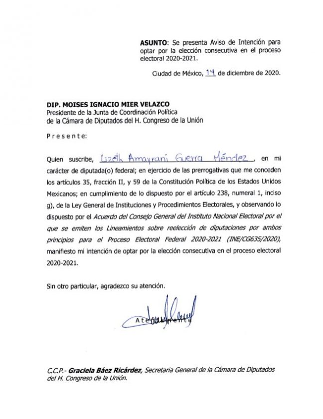 De acuerdo con el listado difundido por la Cámara de Diputados, 441 de los 500 diputados presentaron su carta de intención para optar por la elección consecutiva en el proceso electoral 2020-2021, con base en los artículos 35 y 59 de la Constitución, así como en el artículo 238 de la Ley General de Instituciones y Procedimientos Electorales.