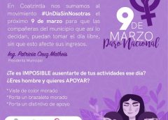 La presidenta municipal de Coatzintla, Patricia Cruz Matheis, informó que, en sororidad con todas las mujeres del país por la escalada en la violencia de género, todas la empleadas del ayuntamiento se sumarán al paro nacional #UnDíaSinMujeres el próximo 9 de marzo.