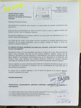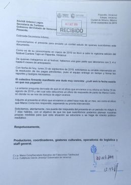 El 19 de agosto, los afectados productores, coordinadores, gestores culturales, operadores de logística y staff en general enviaron un oficio a la secretaria Xóchitl Arbezú en la que le ponían al tanto de la situación que enfrentaban, algunos de ellos hasta seis meses antes de la Cumbre.