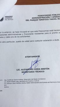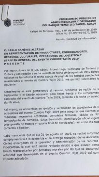 En respuesta, el 4 de octubre, Alejandro Coria Bretón, secretario técnico del Fideicomiso Público de Administración y Operación del Parque Temático Takilhsukut les informaron a través del oficio ST-FPPTTS-0273/2019 que, por instrucciones de la Secretaria Arbesú Lago, se encontraban gestionando los recursos para hacer frente a los compromisos derivados de Cumbre Tajín 2019, teniendo entonces “un avance significativo”.