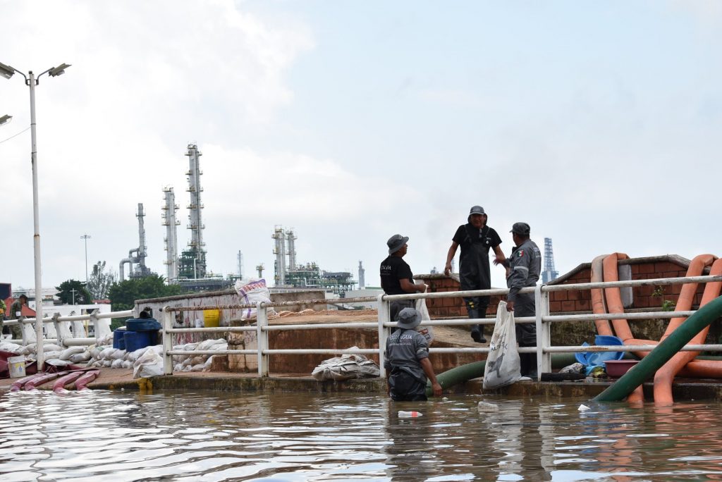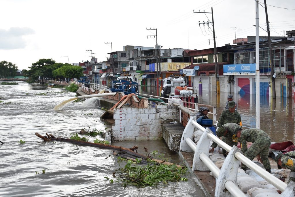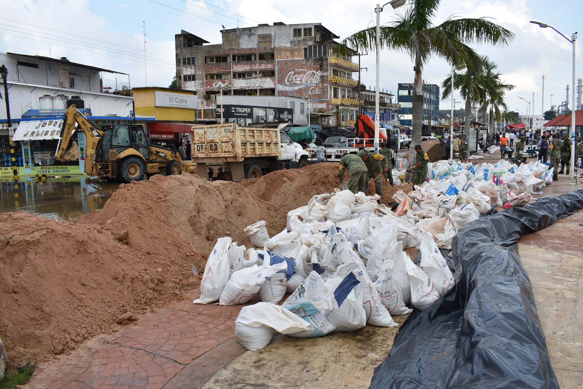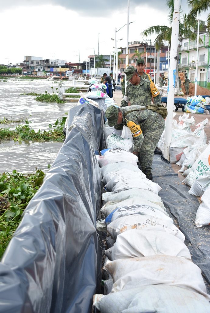 En el área del malecón continúan trabajando los elementos del Ayuntamiento, de la Comisión Nacional del Agua, Ejército Mexicano y sociedad civil en el levantamiento de un muro provisional de contención a fin de evitar que el nivel del agua alcance mayores niveles en la zona centro de la ciudad.