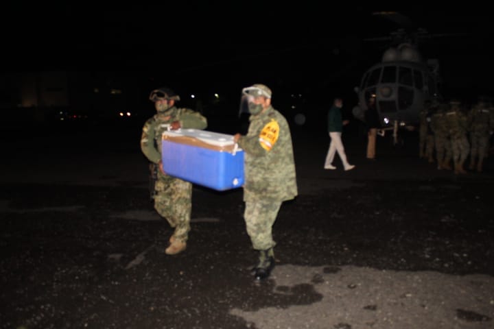 Las vacunas fueron trasladadas vía aérea por medio de un helicóptero de la Armada hasta el aeropuerto nacional Fausto Vega Santander, ubicado en Tuxpan, alrededor de las 20:00 horas.