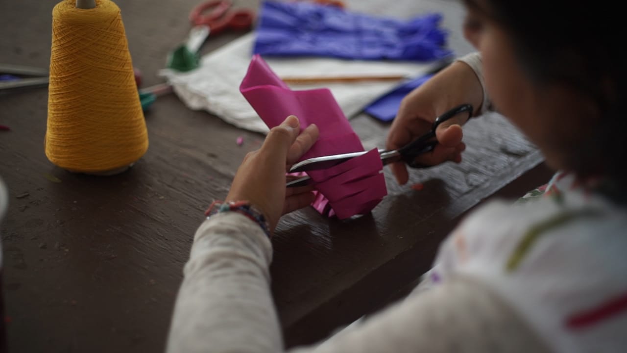 Durante cada sesión, Javier transmite con paciencia una labor que conoce bien: el arte de elaborar papel picado usando papel china y tijeras.