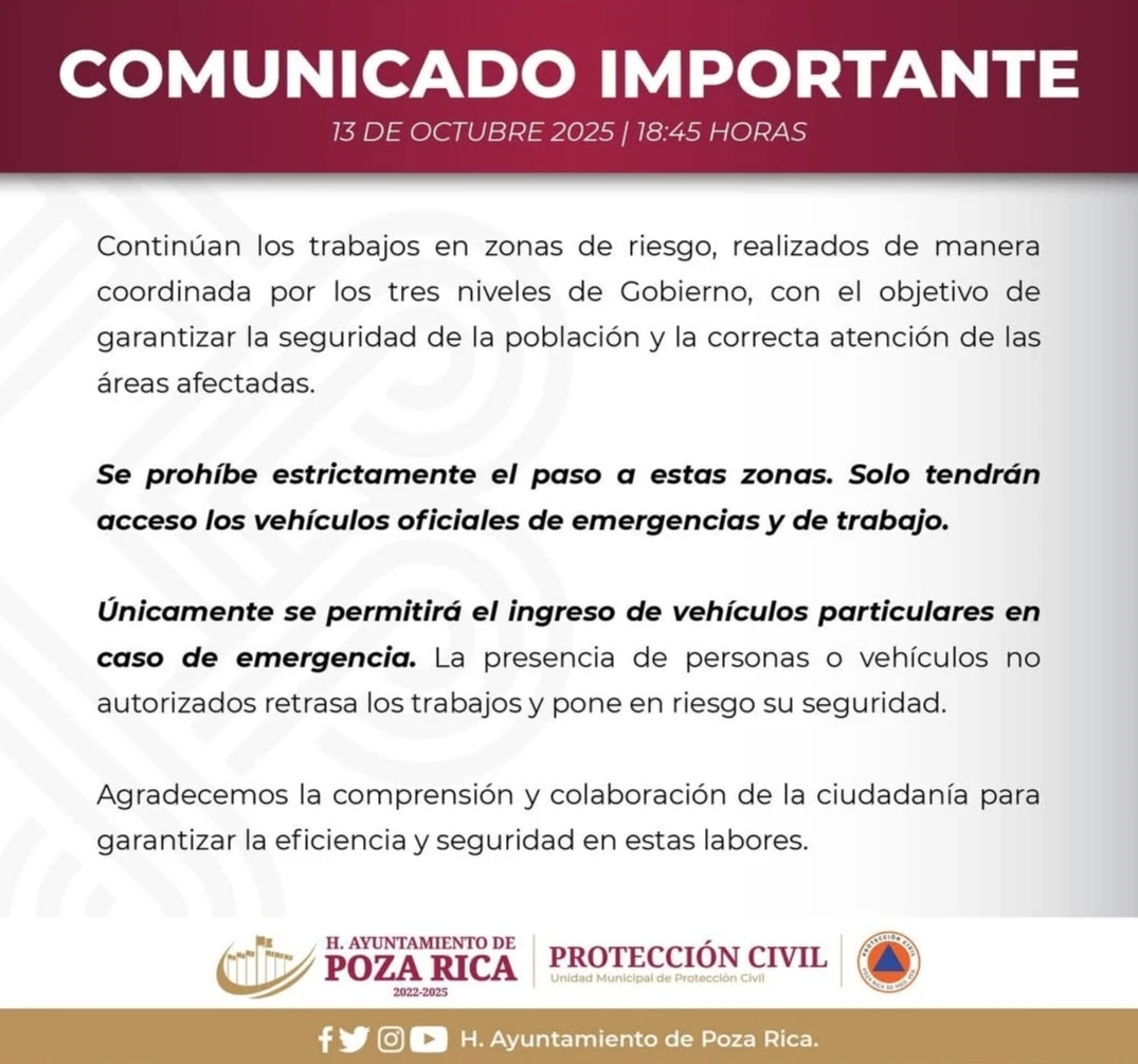 Poza Rica, Ver.– El más reciente comunicado del Ayuntamiento de Poza Rica, emitido la tarde del 13 de octubre, ha generado un fuerte rechazo entre los habitantes afectados por las inundaciones. En el aviso oficial, el gobierno encabezado por el alcalde Fernando “El Pulpo” Remes Garza informó que “se prohíbe estrictamente el paso a las zonas de riesgo” y que solo podrán ingresar vehículos oficiales de emergencia y trabajo, argumentando razones de seguridad.
