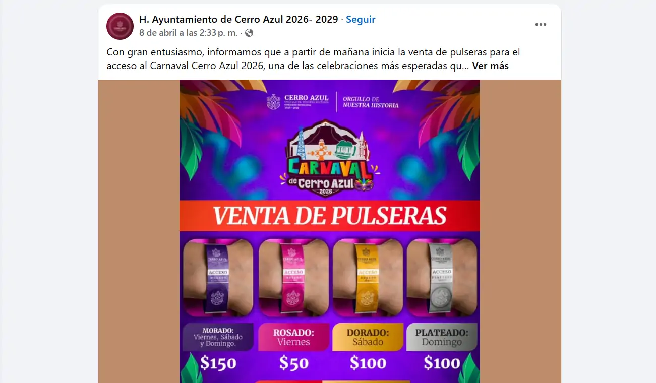 El Ayuntamiento anunció la venta de pulseras para ingresar al carnaval, disponibles en distintos puntos del municipio. Entre los beneficios, se incluye acceso a gradas —si se llega con anticipación— y entrada durante los días del evento en ciertas modalidades.
