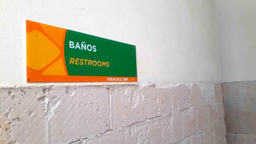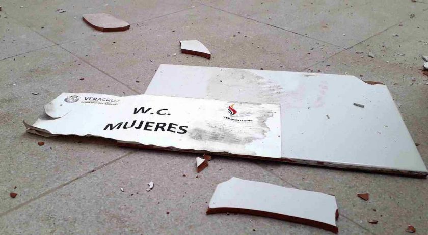 Al interior se observan filtraciones que mantienen encharcado el piso de cemento pulido. Los sanitarios han sido vandalizados y gran parte de las losetas fueron desprendidas, mientras que los aparatos de ejercicio están inutilizables.