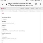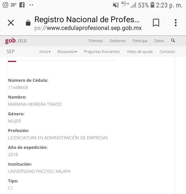 La búsqueda realizada este 27 de diciembre arrojó por fin la cédula profesional 11448668 a nombre de Mariana Herrera Tirado, por el grado académico de licenciada en Administración de Empresas, expedida en el 2018; carrera cursada en la Universidad Paccioli de Xalapa.