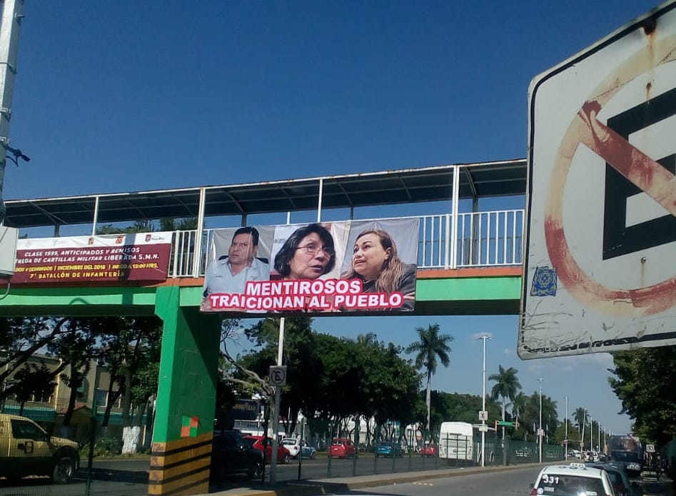Fue en diciembre pasado, previo a la rendición del primer informe de gobierno del presidente municipal Francisco Javier Velázquez Vallejo, cuando se colgó una lona en la que aparecían los rostros de los ediles Brenda Guadalupe Carrión Cabrera, Gregoria Miguel Reyes y Eloy Núñez León, quienes habían votado en contra de la aprobación de los estados financieros.