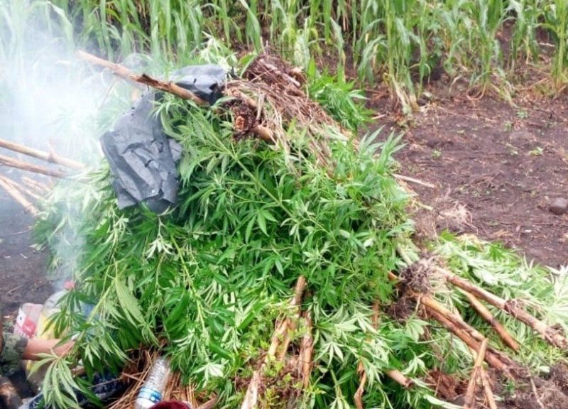 En este predio, elementos de la Policía Federal Ministerial y de Sedena, destruyeron por medio de incineración dos mil 100 plantas de Cannabis Sativa (marihuana) con una altura de 90 a 105 centímetros.