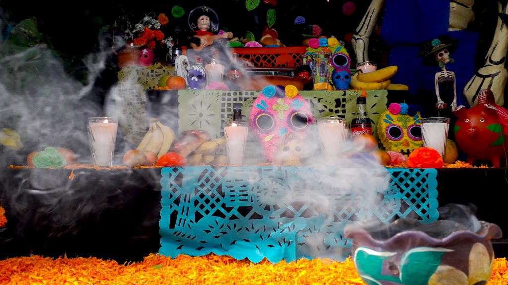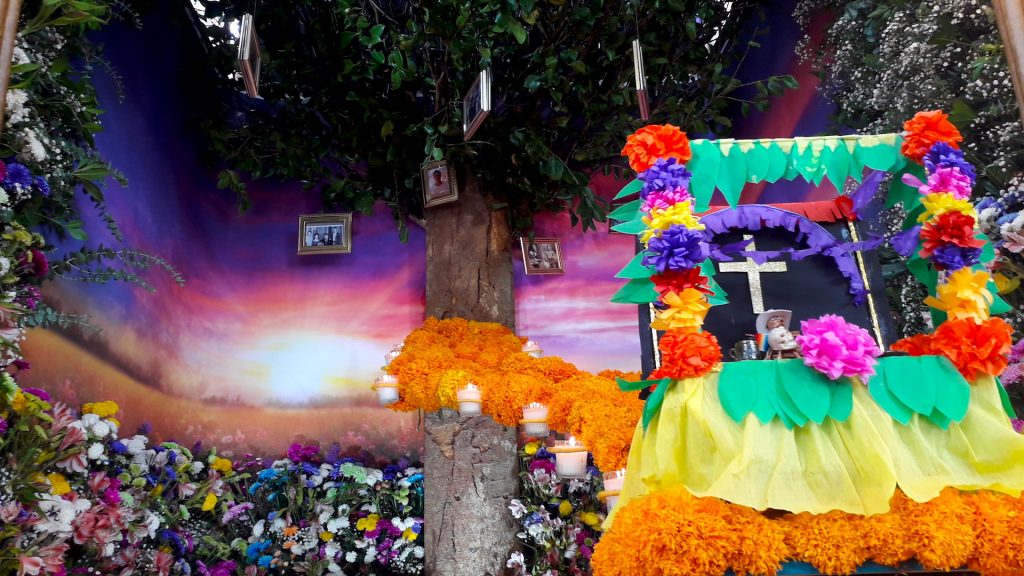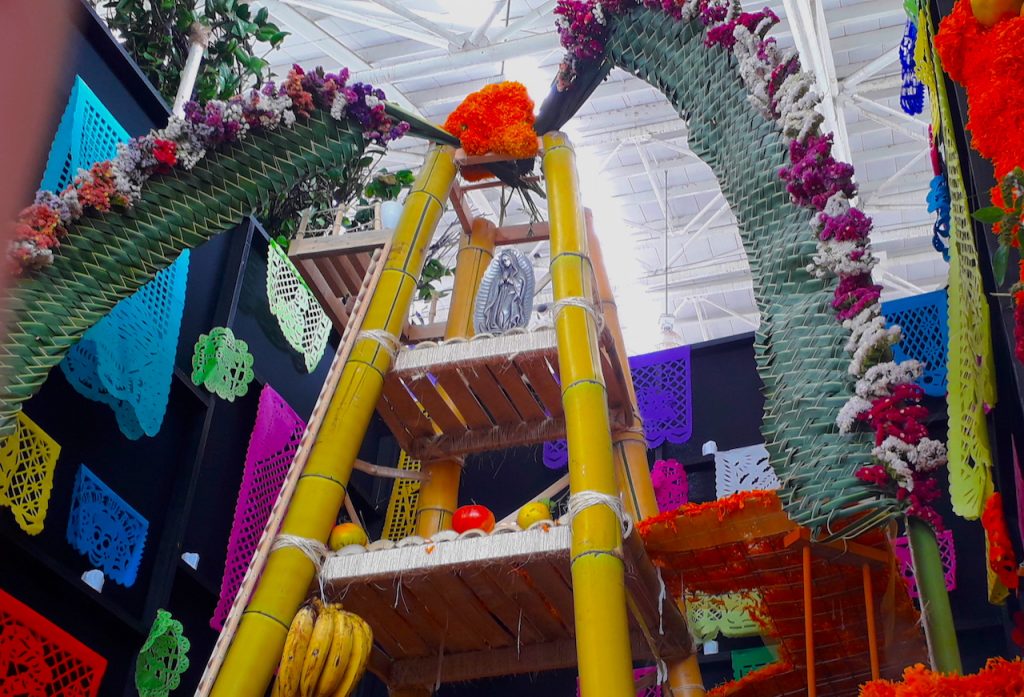 El espectáculo de colores, aromas y sabores dentro del recinto salta de inmediato. El naranja del cempasúchil resalta sobre las hojas de tepejilote con el que se han forrado los altares; junto con los troncos de plataneras conforman la parte indígena de esta celebración.