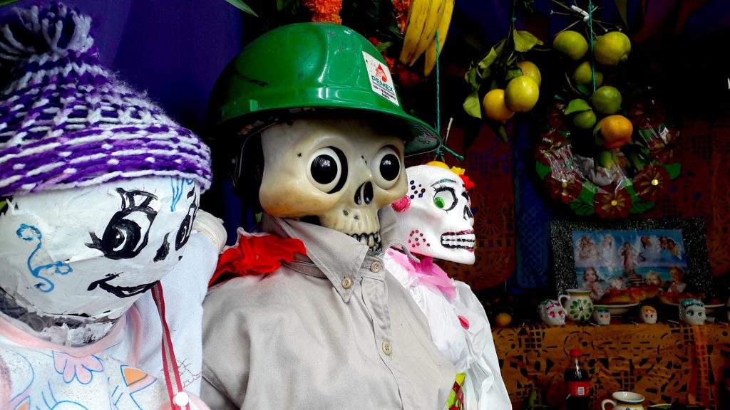 Calacas vestidas de trabajadores petroleros, representaciones de Frida Kahlo y xoloitzcuintles elaborados con papel maché resguardan los altares.