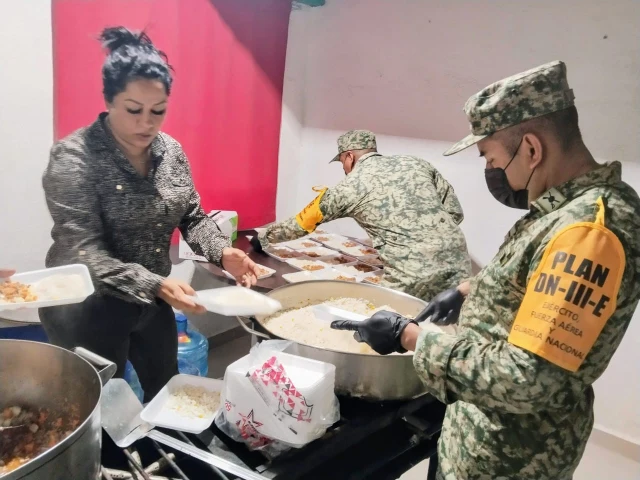 Como parte de las acciones de auxilio, se instaló una Célula de Cocina Comunitaria en el Auditorio Municipal, desde donde el personal militar, en coordinación con Protección Civil Municipal, elabora y distribuye alimentos calientes a personas damnificadas.