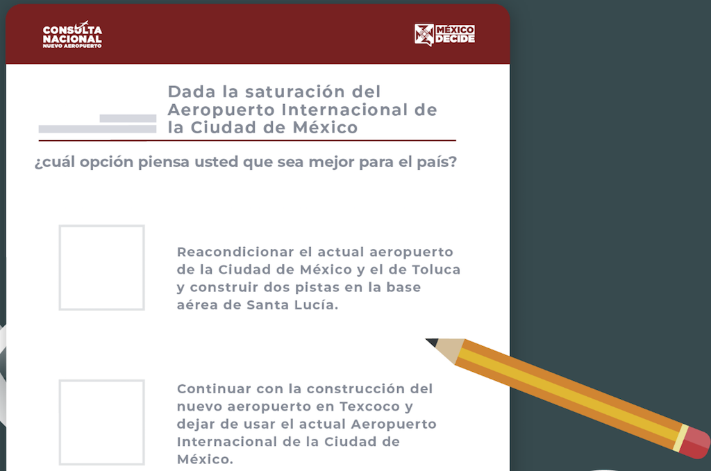 En la boleta aparecerán dos opciones, la primera es el reacondicionamiento del actual aeropuerto de la Ciudad de México y el de Toluca y construir dos pistas en la base aérea de Santa Lucía; la segunda tiene que ver con la continuación de la construcción del nuevo aeropuerto en Texcoco y dejar de usar el actual Aeropuerto Internacional de la Ciudad de México.