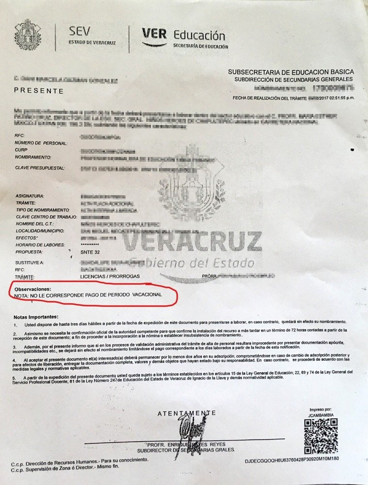 Con ese argumento la Secretaría de Educación de Veracruz elabora los contratos de maestros de nuevo ingreso y quienes cubren interinatos (permisos) por menos de seis meses, en detrimento de los alumnos de los planteles escolares en el estado y de los derechos de los trabajadores de la educación de los distintos sindicatos en Veracruz.