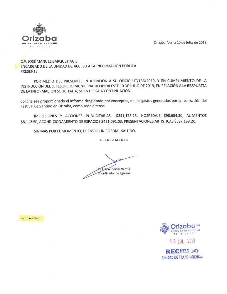 Poza Rica, Ver.- De acuerdo con la información presentada en el oficio UT/141/2019, el Ayuntamiento de Orizaba destinó en 2018 la cantidad de 1 millón 466 mil 232.18 pesos, para la realización del Festival Internacional Cervantino; un millón de pesos menos de lo anunciado por el Gobierno de Poza Rica para el evento que se llevará a cabo del 25 al 27 de octubre en la plaza cívica.