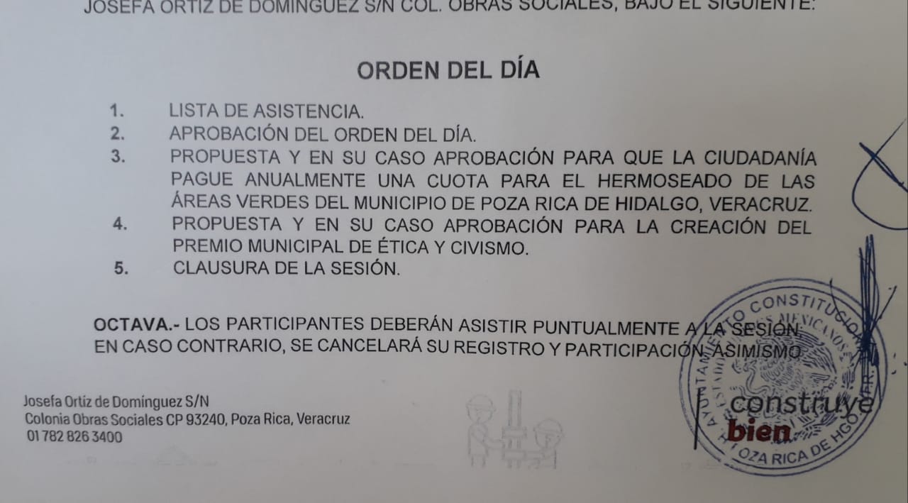 En la que será la tercera sesión de cabildo abierto, la orden del día establece dos puntos a tratar, el primero de ellos la propuesta y en su caso aprobación para que la ciudadanía pague anualmente una cuota para el hermoseado de las áreas verdes del municipio.