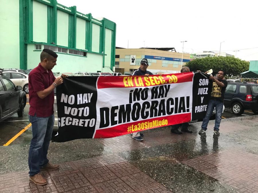 Un grupo de trabajadores de Petróleos Mexicanos se manifestaron frente a la sede de la Sección 30 del STPRM, inconformes por el presunto fraude que se cometerá este día durante las votaciones para la renovación de la dirigencia y cuerpo de gobierno.