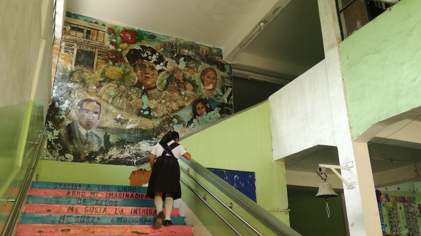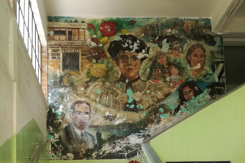 Bajo una lona y severamente deteriorado por el paso de los años y la humedad, el mural a la maestra María Esperanza Morales Mérida se pierde lentamente.