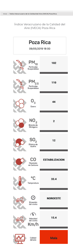 Para la ciudad de Poza Rica el resultado fue similar, con 110 puntos para las PM 2.5; 102 puntos para las PM 10; y 44 puntos de ozono.