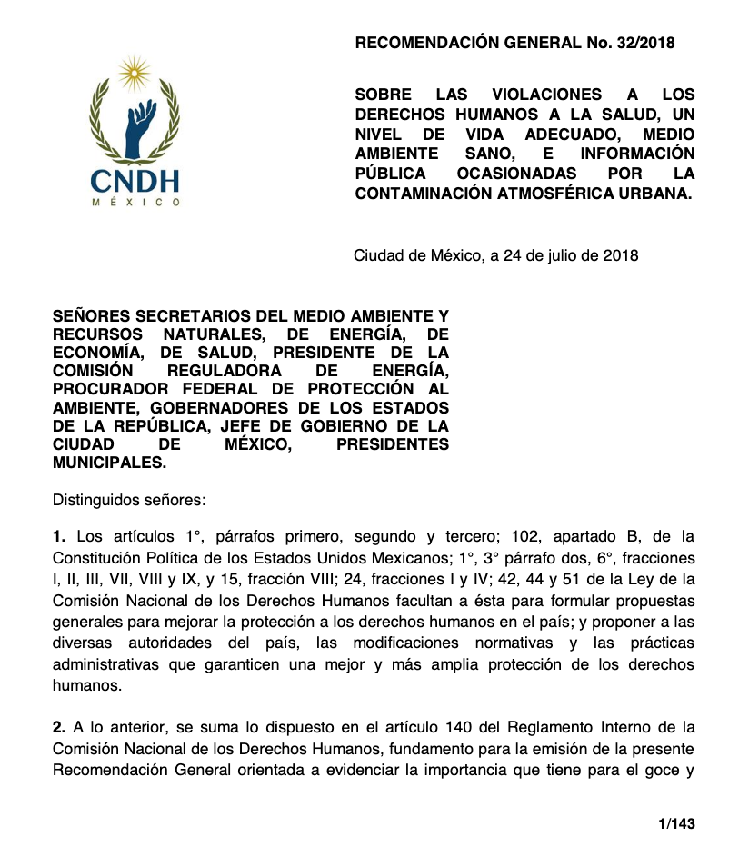El 24 de julio de 2018, la Comisión Nacional de los Derechos Humanos emitió la recomendación general número 32/2018, sobre las violaciones a los derechos humanos a la salud, un nivel de vida adecuado, medio ambiente sano, e información pública ocasionadas por la contaminación atmosférica humana.
