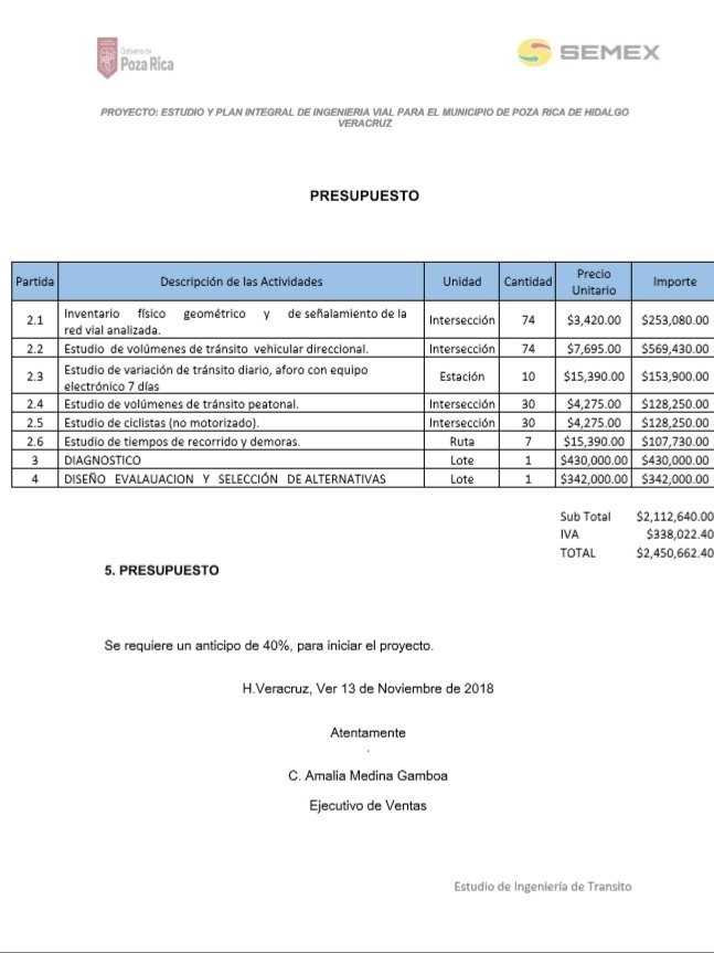 De acuerdo con el presupuesto entregado por la empresa al edil, del cual el reportero cuenta con una copia digital, Semex pretende cobrar 2 millones 112 mil 640 pesos más IVA al ayuntamiento por realizar un inventario físico geométrico y de señalamiento de la red vial analizada, estudio de volúmenes de tránsito vehicular direccional, de variación de tránsito diario, aforo con equipo electrónico y de tránsito peatonal.