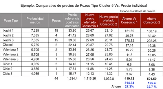 Además del logro de reducción en el tiempo de ejecución, sin corrupción, con procesos innovadores y el apoyo del sector privado, Pemex logró una reducción promedio ponderada de 26 por ciento en el costo de los nuevos contratos de servicios. Para el cálculo del ahorro se toma como referencia el costo unitario de los mismos conceptos contratados en años anteriores. En la tabla siguiente se muestra un ejemplo con el comparativo de precios bajo los cuales se están contratando los nuevos servicios.