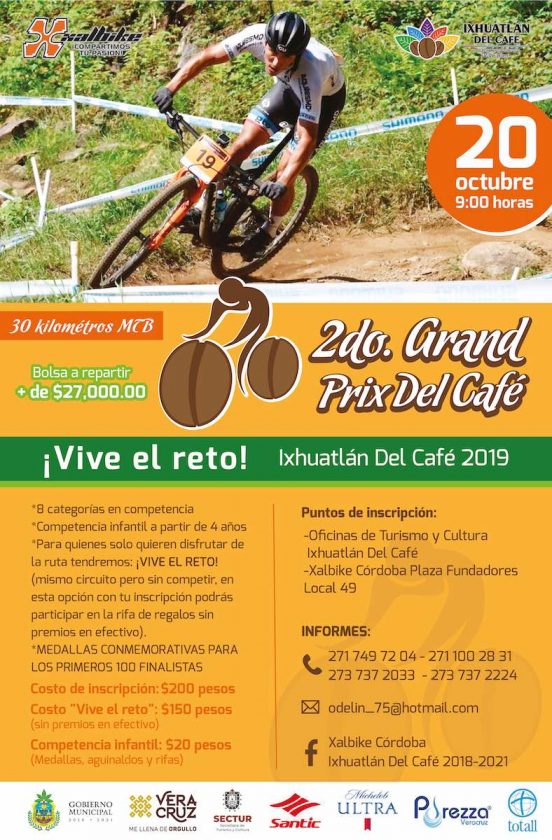 Ixhuatlán del Café.- Una bolsa superior a los 27 mil pesos serán repartidos durante el Segundo Grand Prix del Café 2019, el cual se desarrollará el próximo 20 de octubre en la ruta de 30 kilómetros de ciclismo de montaña en este municipio.