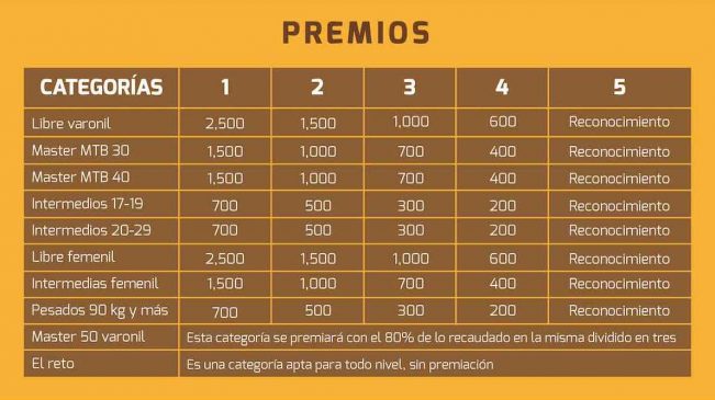 Además de las ocho categorías en competencia con premios que van desde los 2 mil 500 pesos a los primeros lugares, habrá dos categorías especiales que son Master varonil de 50 años o más en la que se premiará de acuerdo a lo recaudado de la inscripción de esa misma categoría en tres lugares, así como «El Reto» donde no habrá premiación pero sí medalla y la experiencia de cruzar todo el trayecto.