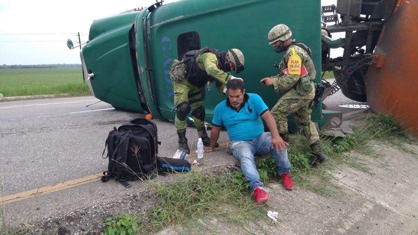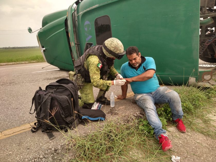 Personal del 51 Batallón de Infantería acudieron al auxilio de una persona que había resultado herida tras volcar el tractocamión que conducía sobre la carretera federal no. 70 Tampico-Valles, prestándole los primeros auxilios y facilitando el tránsito vehicular sobre la vía.