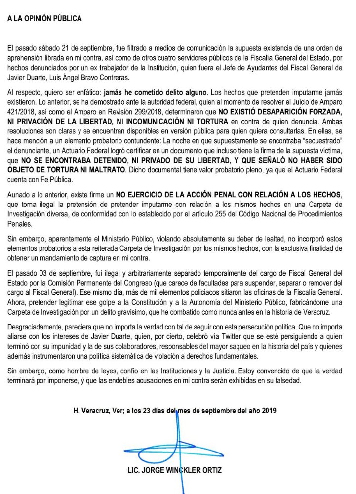 A través de la imagen de una carta a la opinión pública enviada a los medios de comunicación, escrita presuntamente por Jorge Winckler Ortiz en su calidad de prófugo de la justicia, asegura que los señalamiento en su contra y por los cuales le fue girada una orden de aprehensión son falsos y que jamás ha cometido delito alguno.