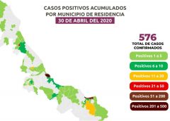 La cifra de positivos es 576 en 69 demarcaciones: Veracruz 209, Coatzacoalcos 69, Boca del Río 56, Poza Rica 44, Minatitlán 13, Orizaba y Xalapa 12, Alvarado 10, Fortín 9, Cosoleacaque y Papantla 8, Córdoba y Medellín 7, Cosamaloapan 6, Martínez de la Torre, Misantla y San Andrés Tuxtla 5; Acayucan, Amatlán de los Reyes, Emiliano Zapata, Ixtaczoquitlán, José Azueta, Santiago Tuxtla, Tierra Blanca y Tuxpan 4; Ayahualulco, Cerro Azul, Coatzintla, Jáltipan y Tlacotalpan 3; La Antigua, Cazones, Maltrata, Perote y Puente Nacional 2.