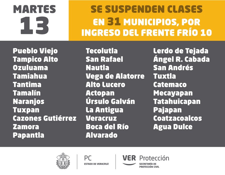 Con base en las recomendaciones de la Secretaría de Protección Civil, la Secretaría de Educación de Veracruz anunció a través de un comunicado la suspensión de clases en todos los niveles educativos en 31 municipios, para este martes 13 de noviembre, con motivo del descenso de temperaturas y lluvias que generará a su paso el Frente Frío número 10.