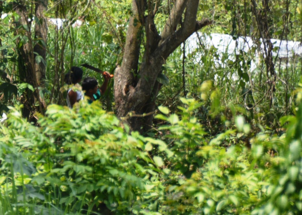 Niños realizan tareas de desmonte a un lado de tuberías de Pemex, en Poza Rica