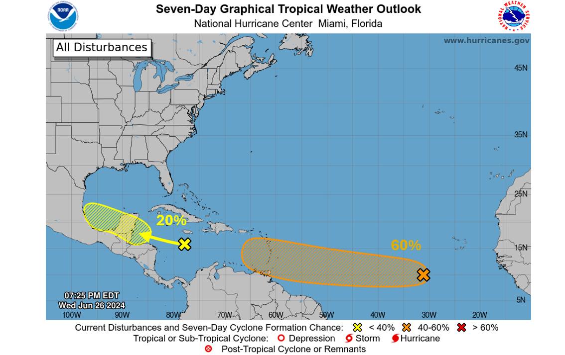 En el Atlántico, dos ondas tropicales están captando la atención de meteorólogos por su potencial de desarrollo. La primera, designada como #94L, se encuentra en el centro-oeste del Mar Caribe y avanza rápidamente hacia el oeste a unos 25 mph. Aunque las condiciones actuales limitan su crecimiento, se espera que mejoren hacia el fin de…
