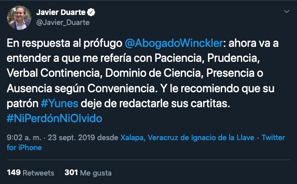 Javier Duarte envía peculiar saludo a Jorge Winckler, ¡desde Xalapa!
